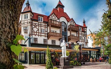 Главной особенностью фахверкового гостевого дома является архитектура в стиле модерн. Здание украшено перекладинами, башенками и другим традиционными элементами